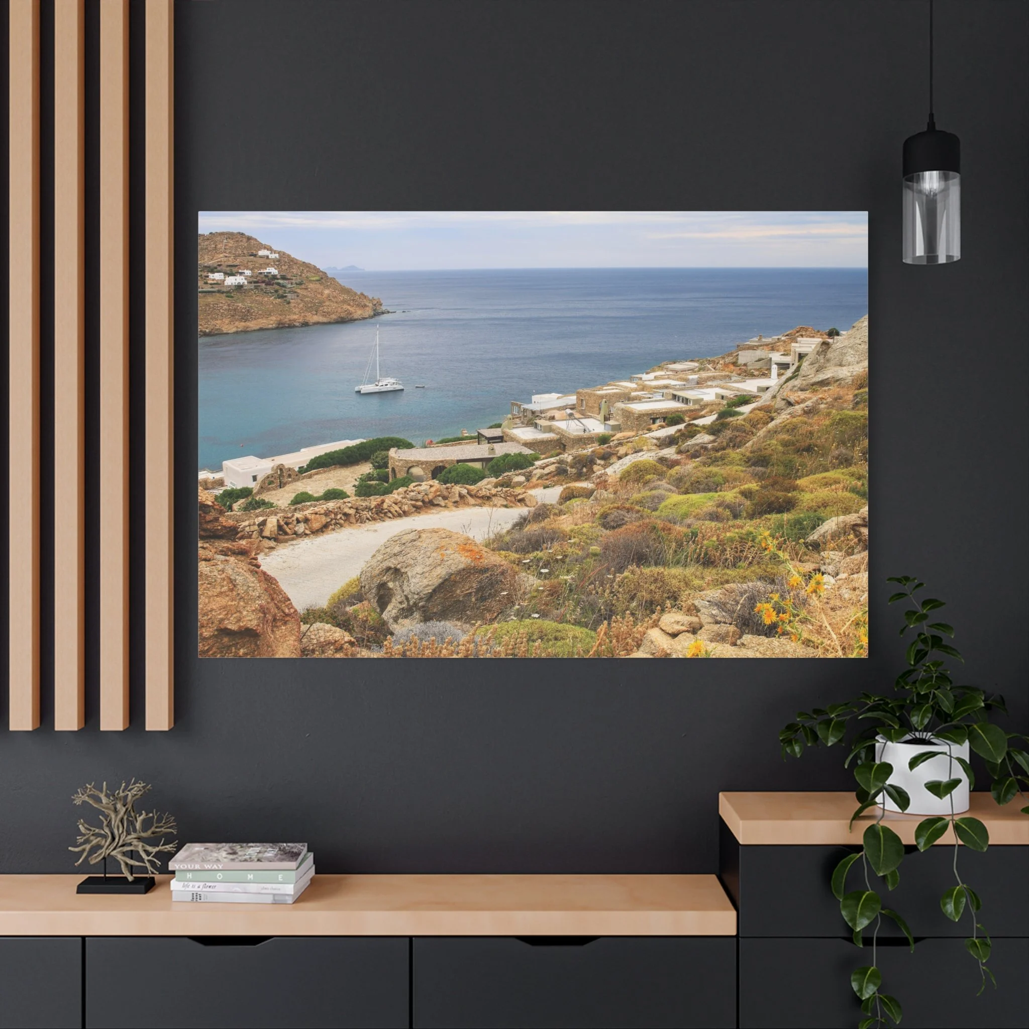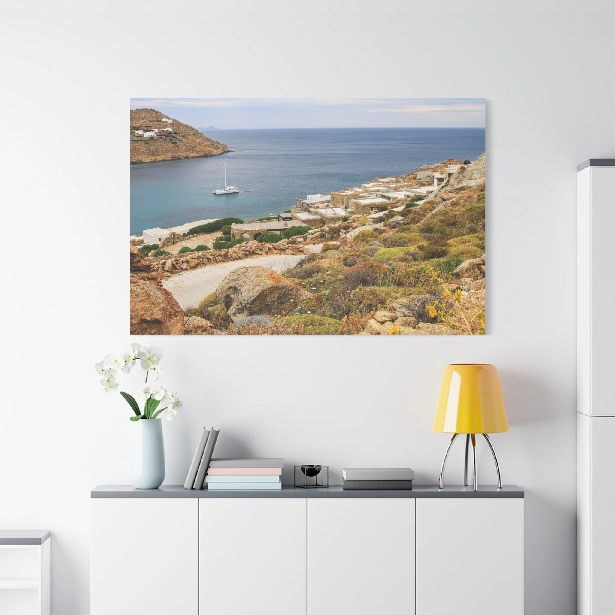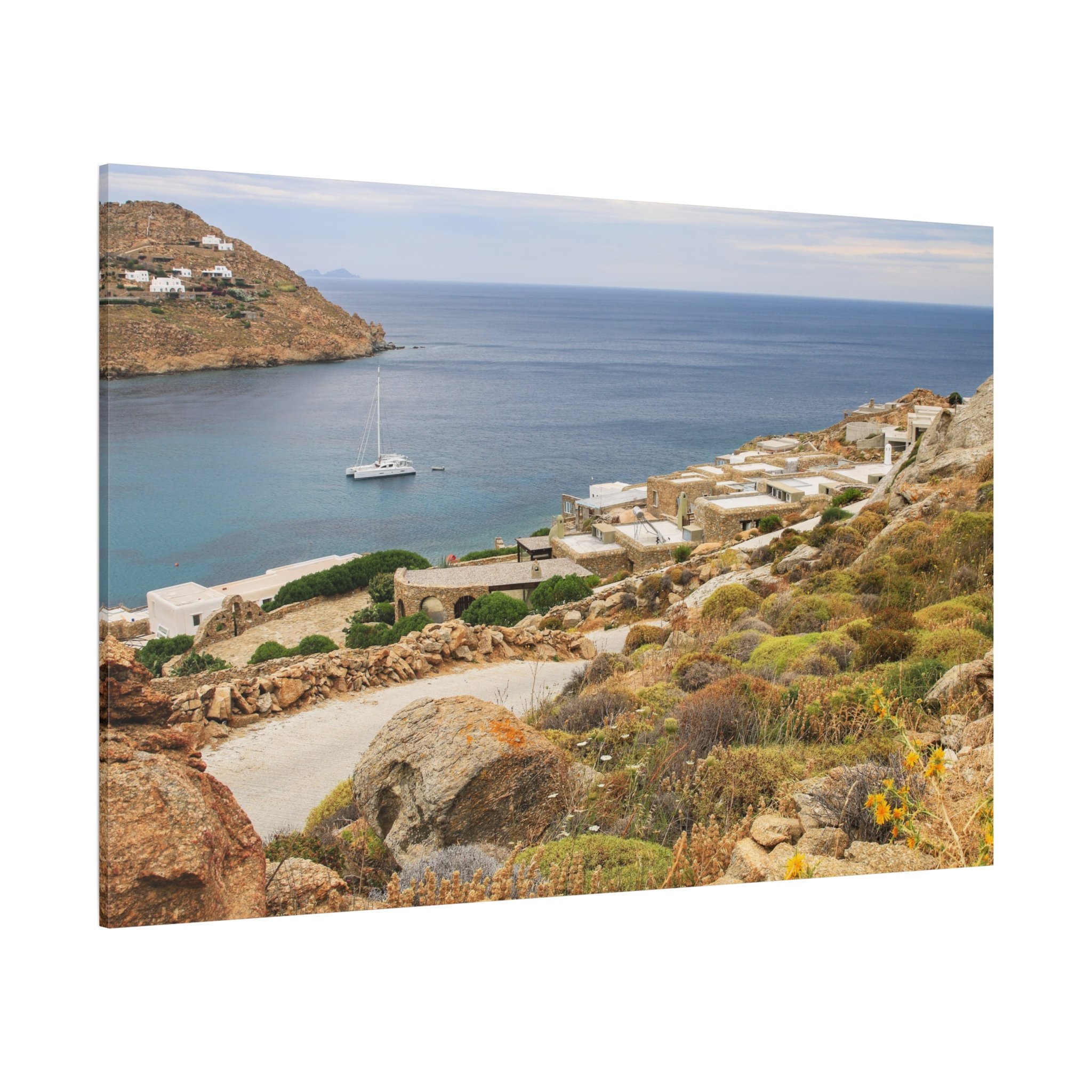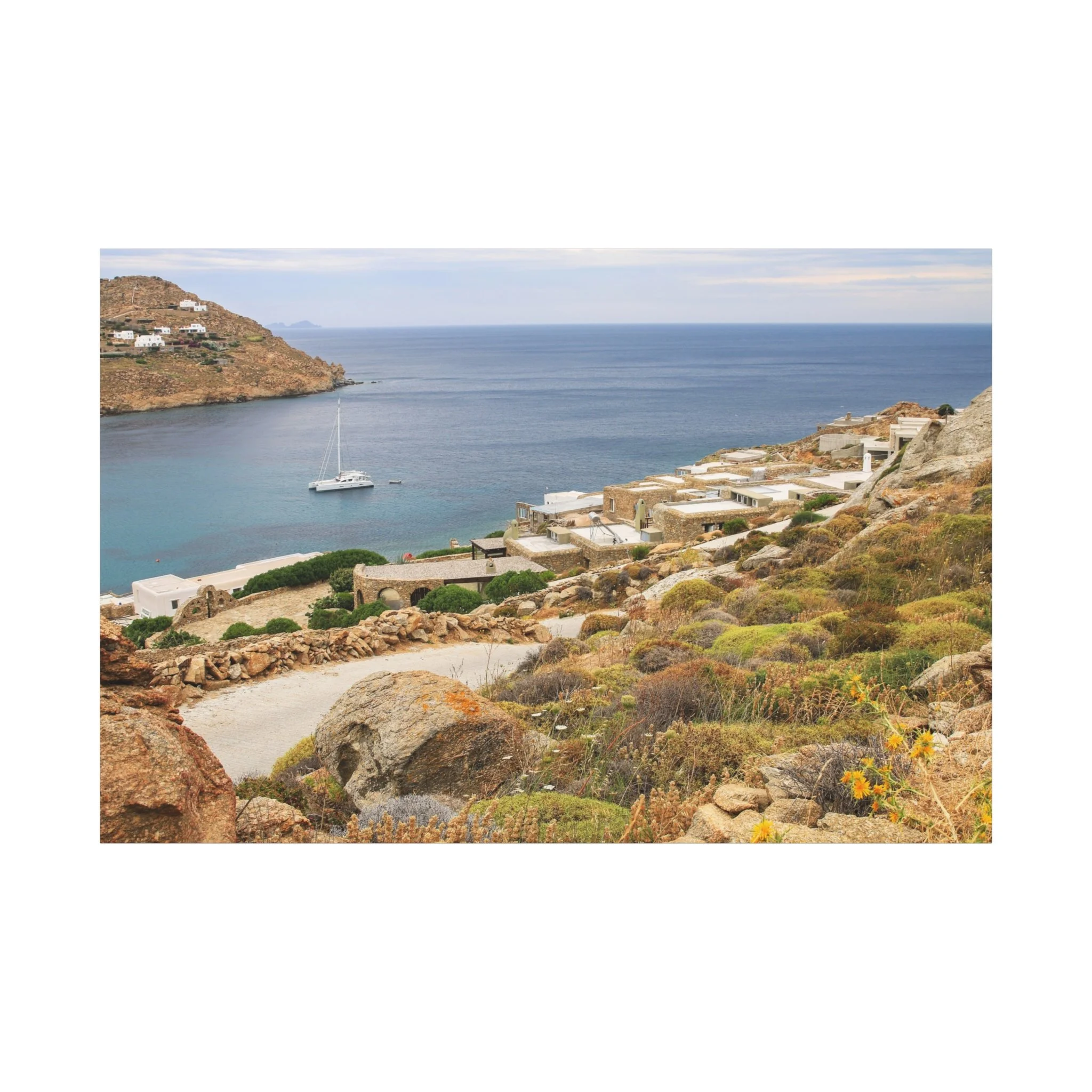 From a cliffside overlook in Mykonos, the Aegean stretches into calm blue distance, dotted with a slow‑moving sailboat. Wild grasses and coastal flowers frame the foreground, adding natural texture to the open horizon. This piece captures the quiet elegance of the island’s coastline, a blend of soft light, sea air, and expansive Mediterranean calm.